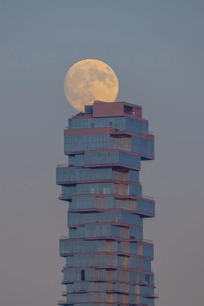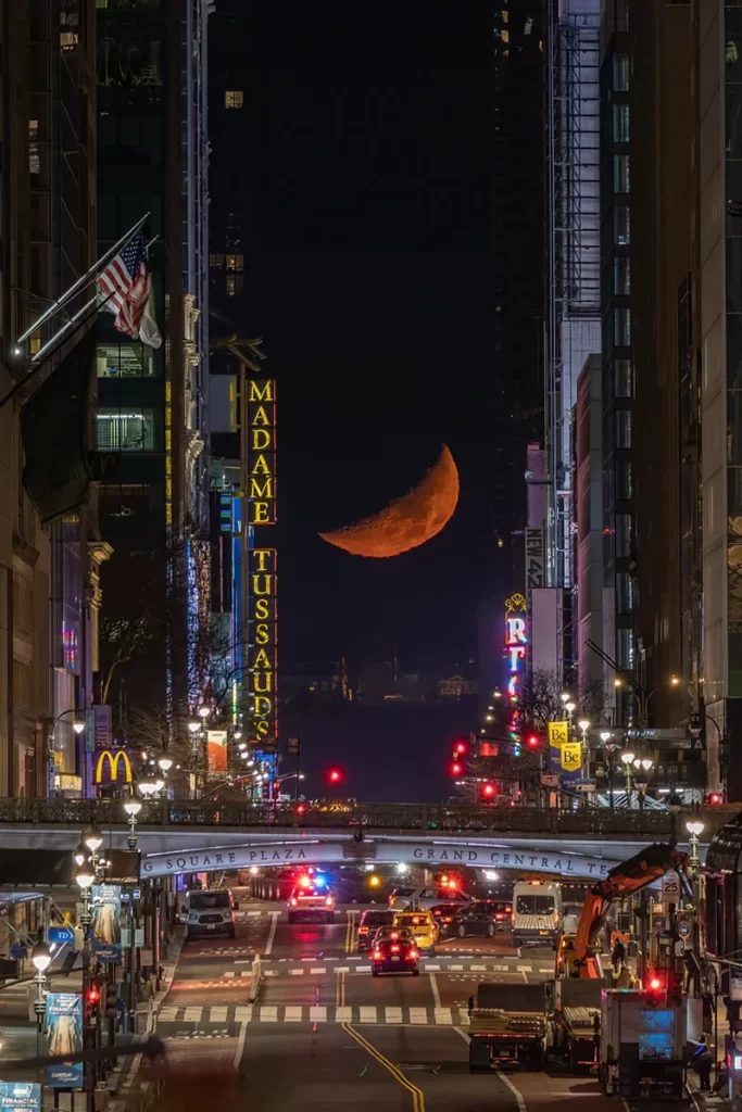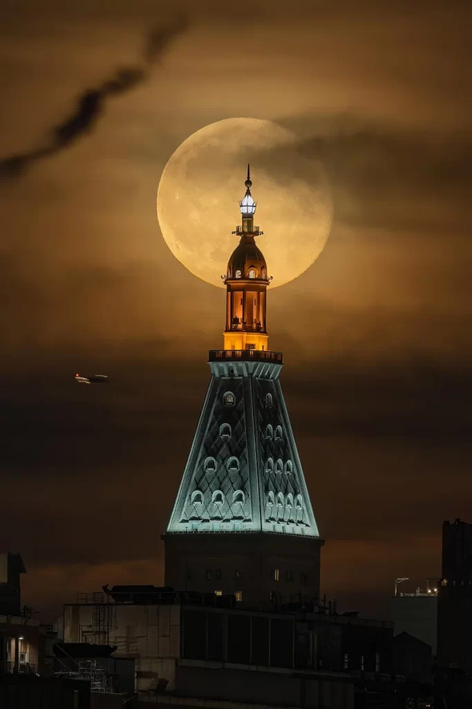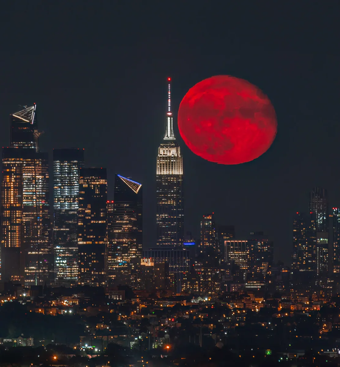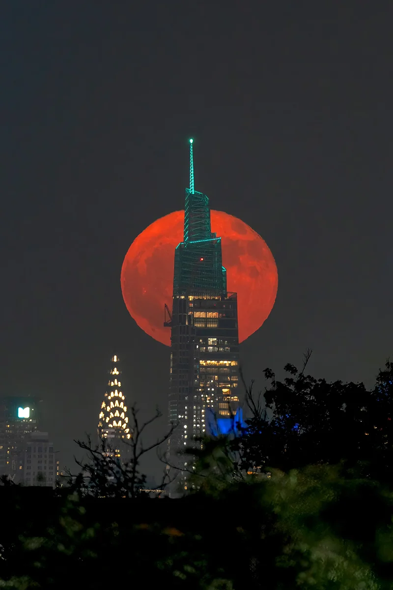 Here’s a hazy moonrise as seen next to the Empire State Building, NYC, USA captured from over 13 miles away!