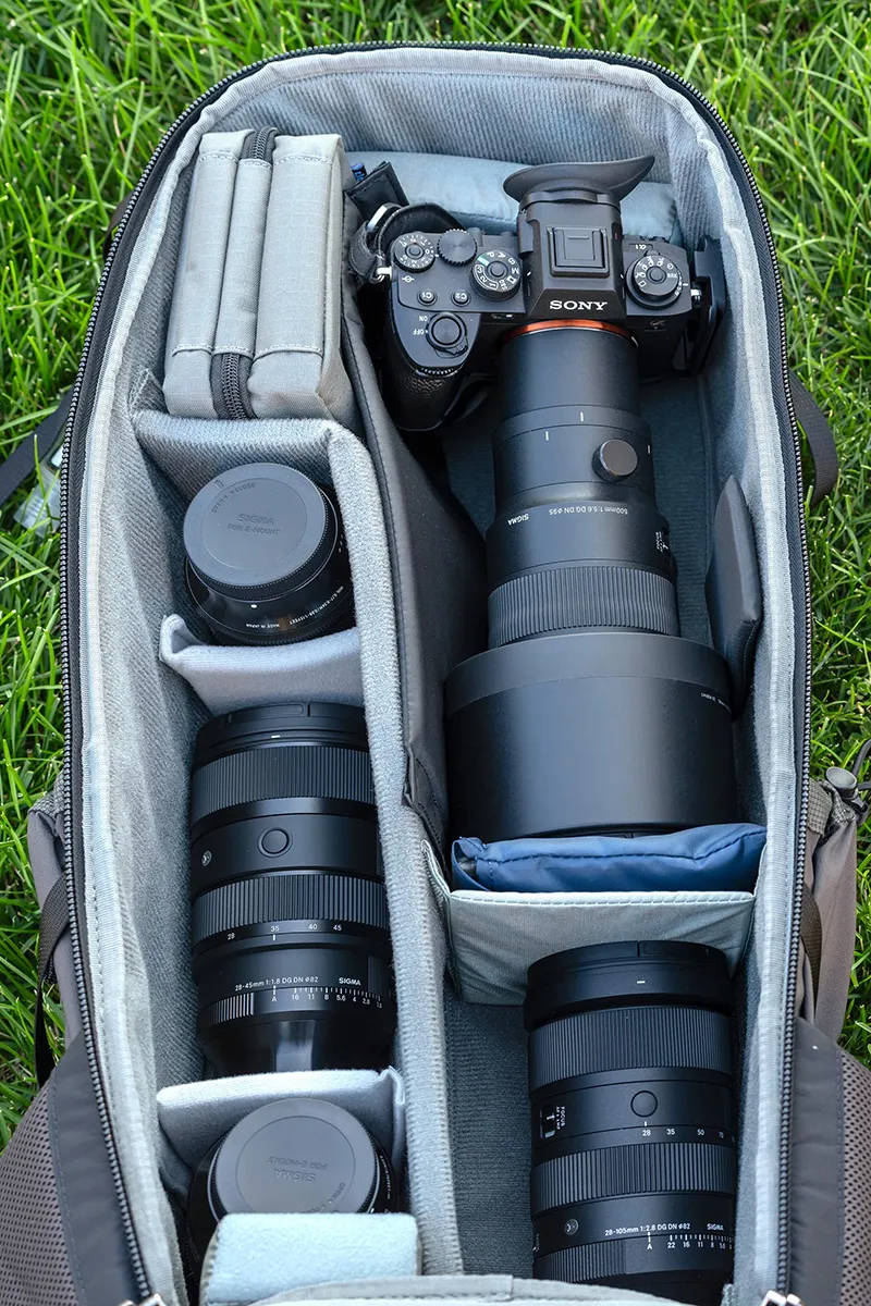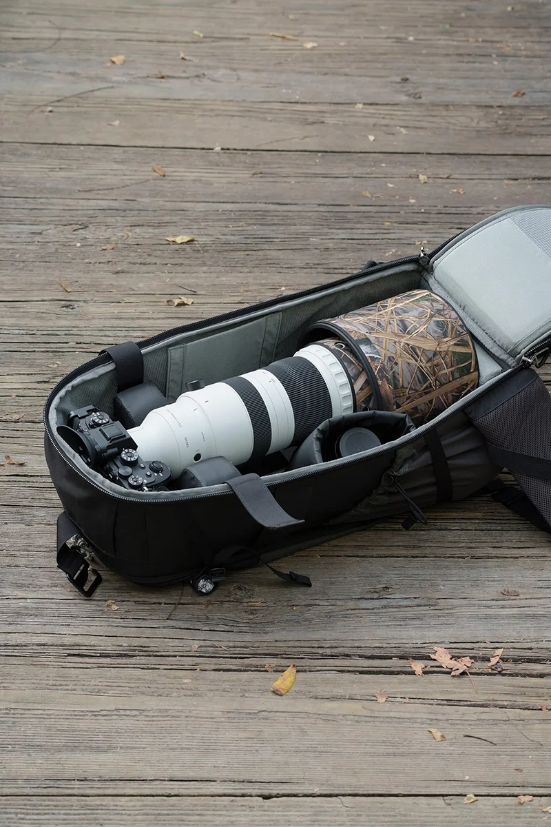 This camera pack fits my Sony Alpha 1 attached to the Sigma 300-600mm f/4 DG OS Sports lens including the lens hood! The bag can also hold an extra camera or a lens on its side with the included Think Tank divider.