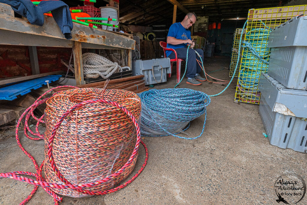 20mm lenses let you capture several subjects within a scene. Wide-angle scenes like this tell the story of Daniel, a fisherman in Atlantic Canada, working with the tools of his craft. Careful photo editing was required to balance the light and dark parts of this frame.