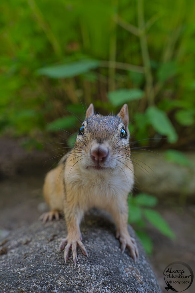 When focused close to a wide-angle lens, the main subject will appear front-heavy. Also, like all lenses, the closer the focus with wide-angle lenses, the shallower the depth of field. I focused on the Eastern Chipmunk’s eyes at only a few inches away from the lens. Don’t expect a wide-angle lens to offer extensive depth when focusing on excessively close subjects.