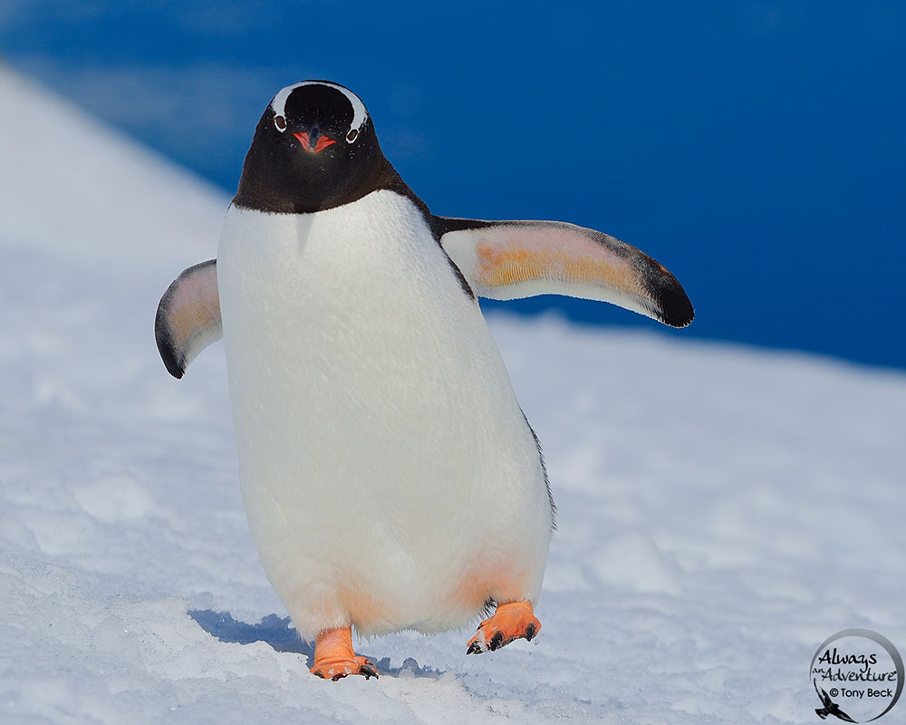 Telephoto lenses make it almost impossible for distant backgrounds to become sharp. The background behind this Gentoo Penguin remains blurry, even with a short telephoto of 300mm.
