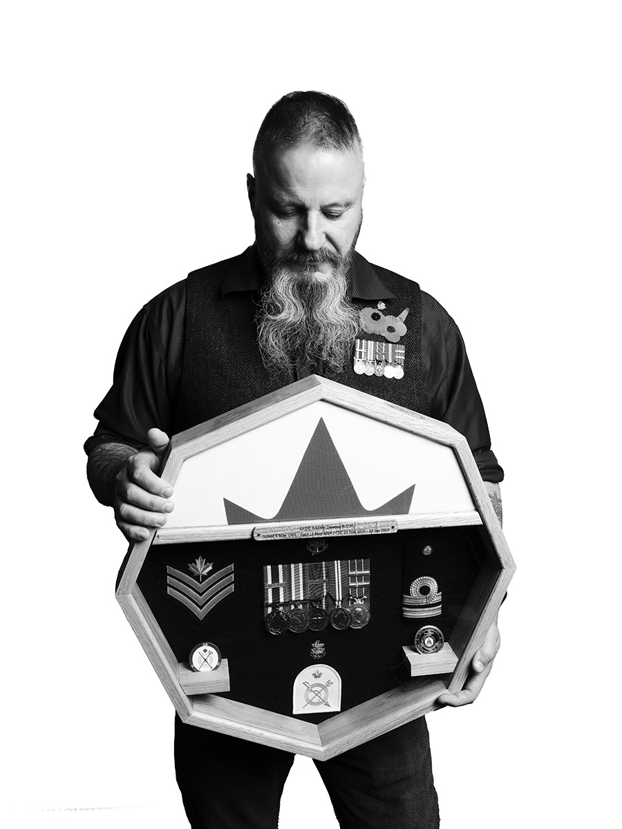This work is part of his Honour Country Sacrifice Project, Trevor’s ongoing national portrait and oral-history project dedicated to active and retired members of the Canadian Armed Forces. The mission is ambitious and intentional: to capture 400 stories from coast to coast to coast, representing all gender identities, communities of colour, Indigenous Peoples and members of the LGBTQ2+ community. Every portrait is a reminder that service in uniform has never been one-dimensional.