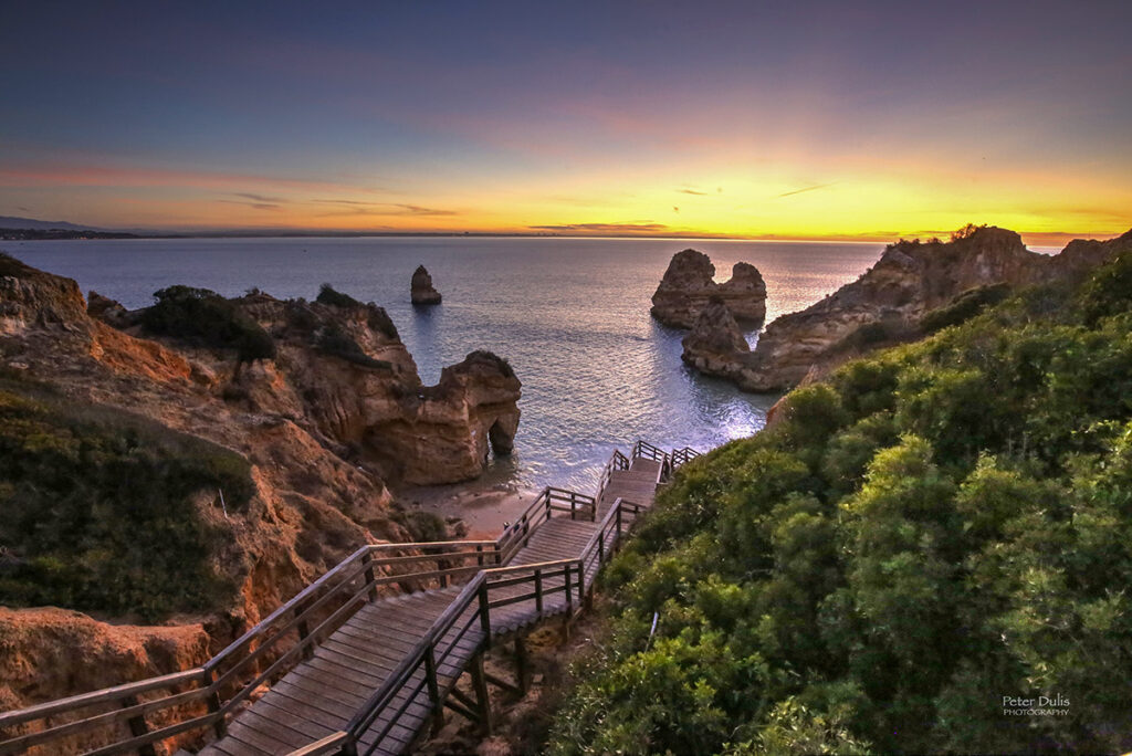The Praia do Camilo beach is idyllic, set amidst the golden cliffs of the Ponta da Piedade headland, the sands are soft and golden, and the sea waters calm and crystal-clear. To get to Praia do Camilo, you have to descend down a long wooden flight of stairs of about 200 steps. I loved going here early in the morning and waiting for the golden glow to rise up over the ocean.